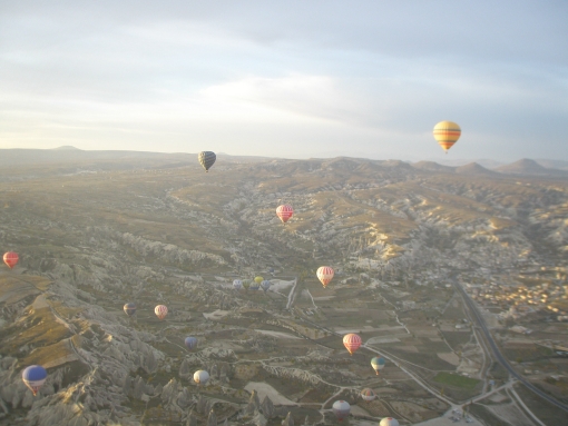 In diesem Ballon waren wir unterwegs ........ und es war einfach nur SUPER und einmalig schön! Mein erster Ballonflug und dann auch noch hier ...... Wir flogen in den Sonnenaufgang hinein. Der Himmel war voller Ballons - ein traumhaft schönes Bild, so beruhigend und gleichzeitig unendliche Freiheit spürend. Wie hatte ich mir eine Ballonfahrt vorgestellt? Gar nicht, bisher war das alles so weit weg gewesen ......... flogen *die Dinger* doch ab und an mal an meiner Wohnung vorbei. Doch JETZT stand dich *mittendrin* und schaute der großen Flamme zu, die uns stetig ein Stück weiter nach oben brachte. Wieviel Meter ..... na so 2000 - 3000 waren es. Mal ganz tief runter um dann wieder aufzusteigen ....... Es war einfach nur SUPERschön und ich buche sofort wieder. Als unser Ballon zur Landung ansetzte staunten wir nicht schlecht, denn wir landeten genau in einem dafür bereitgestellten Anhänger. Präzise! Helfer zogen uns auf den Millimeter dort hinein ....... Wieder auf der Erde war schon etwas ernüchternd, hätte doch bitte so weiter gehen können. Nach der Ballonfahrt, zurück zum Hotel und erst einmal frühstücken. Hunger war nicht so wirklich vorhanden. Anschließend starteten wir zur Rundreise mit dem Bus ins Göremetal, 3 Grazien….. Ein Naturschauspiel, das unsere Herzen gleich wieder höher schlagen ließ........ einmal sogar so hoch, das unser Reisebus ohne uns abfuhr. Aufmerksame MitReisende bemerken, die beiden Damen fehlten und so fuhr der Bus zurück. Unser Busfahrer war die Ruhe selbst und lachte - macht nichts! In der Türkei hat man Zeit ....... bei einer planmäßigen Reiseveranstaltung ist das natürlich etwas anders. Wir erlebten ein Gebiet, dass wir eben noch von oben angeschaut hatten, jetzt aus nächster Nähe, fuhren und liefen mitten hindurch. Laufend wurden wir zu den nächsten Attraktionen gefahren ....... ein- und aussteigen wie bei den Japanern. Fotopause und weiter. So standen wir u.a. vor einem großen Stein, der ein Cafe im 4 Stock hatte und winzig kleine Fenster. Meine Freundin, auf leisen Sohlen, natürlich gleich hinein und plötzlich rief es aus diesem Teil ......... Hallo Birgit! Wir starteten in die sichtbaren und verborgenen Schätze im Herzen Anatoliens. Avanos ....... das rote Tal - Kappadokiens Märchenwelt. Hier erklang diese Musik und wurde MEIN! So genieße ich an meinem Schreibtisch, wann immer möglich .... die Klänge Istanbuls über die Tuffsteinfelsen in Kappadokien. Wir erlebten tanzende Derwische. Ich wußte bisher nicht so sehr viel über Derwische und lauschte jetzt ganz gespannt und berührt ihrer Darbietung, ihrem BETEN. In welcher Reihenfolge wir dann die fantastische Landschaft, auch Mondlandschaft genannt - erkundet haben, weiß ich nicht einmal mehr. Es sind so schnell neue Eindrücke hinzugekommen, dass wir nach ein paar Tagen wußten, weshalb wir noch 7 Tage Badeurlaub dran gebucht hatten. Eines wurde uns immer mehr klar ...... hier wollen wir bald einige Tage ohne Reisegesellschaft und Reiseplan verbringen. Einfach wandern und den Gefühlen lauschen, den Klängen der einzigartigen Berge zu hören. ......was gibt es nur für Blumenläden? In Nevsehir sah ich Blumenläden, da weinte mein Gärtnerinnenherz. Wir lachten und entschieden ...... wir müssen das Universum wechseln. Ich kann euch sagen, es macht Spaß so zu reisen! Ich als Gärtnerin des Herzens hatte einen SO anderen Geschmack, das es schon grotesk war - wir waren in einem anderen Land. Akzeptanz! Anerkennen was ist! Wie lange waren wir in diesem Gebiet?